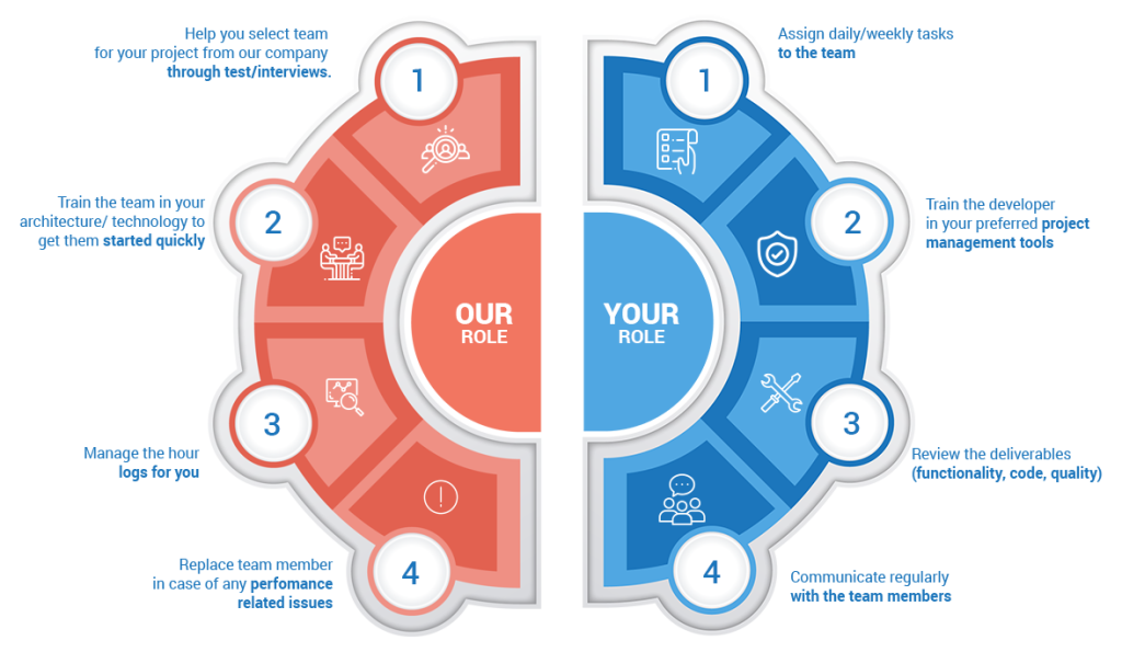 First a rough effort estimate for the agreed project scope is shared along with a technical proposal. If the project is estimated at 3 man months or higher, then we need QA, PM as well on the project.